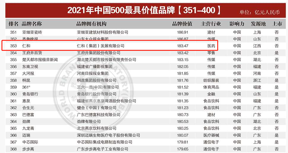 仁和品牌連續十五年入選中國500最具價值品牌榜