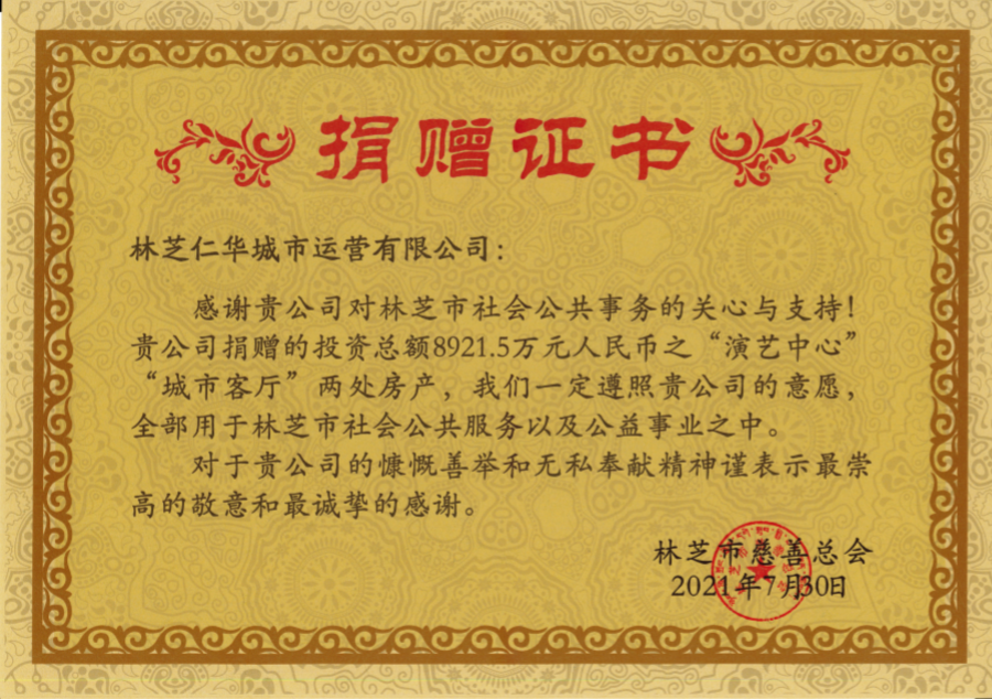 2021年7月30日下午,仁和集團(tuán)下屬林芝項(xiàng)目單位——林芝仁華城市運(yùn)營(yíng)有限公司與林芝市慈善總會(huì)正式舉行捐贈(zèng)簽約儀式,將投資總額約8921.5萬(wàn)元、建筑總面積11640.37平方米的自建房產(chǎn)工布天街項(xiàng)目中的“演藝中心”“城市客廳”無(wú)償捐贈(zèng)與林芝市慈善總會(huì),用于林芝市發(fā)展社會(huì)公共服務(wù)以及公益事業(yè)。善心善舉,彰顯了仁和強(qiáng)烈的社會(huì)擔(dān)當(dāng)。