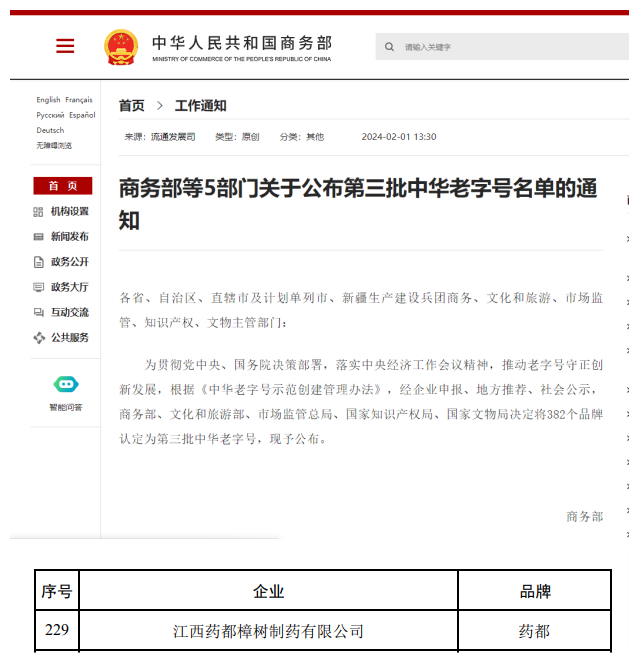 2024年2月1日下午,由商務(wù)部、文化和旅游部、市場(chǎng)監(jiān)管總局、國(guó)家知識(shí)產(chǎn)權(quán)局、國(guó)家文物局五部門(mén)聯(lián)合發(fā)文公布了382個(gè)品牌認(rèn)定為第三批中華老字號(hào)。仁和集團(tuán)旗下“藥都”品牌位列其中。據(jù)悉,此次江西共認(rèn)定13個(gè)中華老字號(hào),“藥都”是唯一一個(gè)江西省醫(yī)藥品牌中華老字號(hào)。