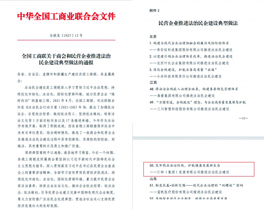 近日,全國工商聯下發《關于商會和民營企業推進法治民企建設典型做法的通報》,仁和集團憑借 “筑牢藥品法治防線,護航健康發展新生態” 的創新實踐,成功入選法治民企建設典型案例。作為江西省藥品行業唯一入選企業,集團系統性法治建設經驗被列為國家級可復制推廣范例,彰顯了民營企業在《民營企業促進法》指引下,以法治促發展的積極作為。